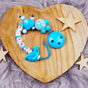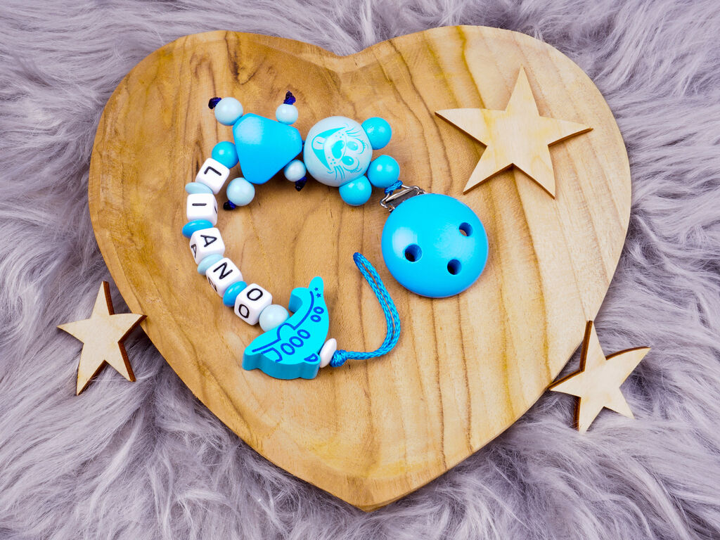 Die abgebildeten Schnullerketten sind Designbeispiele, die je nach Länge des Namens oder nach Euren Individualisierungswünschen verändert werden um die gesetzliche Norm der Schnullerketten von 22cm Länge (ab Clip) nicht zu überschreiten.