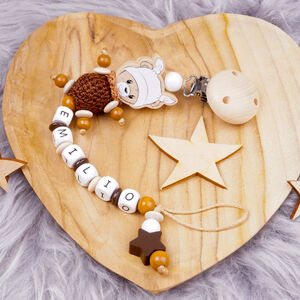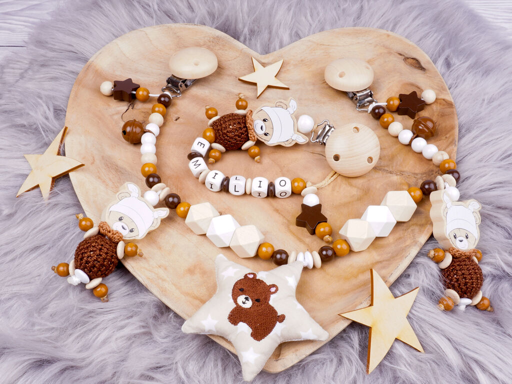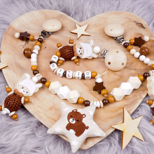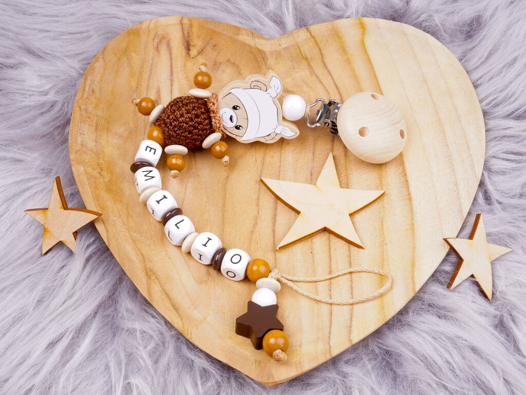 Die abgebildeten Schnullerketten sind Designbeispiele, die je nach Länge des Namens oder nach Euren Individualisierungswünschen verändert werden um die gesetzliche Norm der Schnullerketten von 22cm Länge (ab Clip) nicht zu überschreiten.