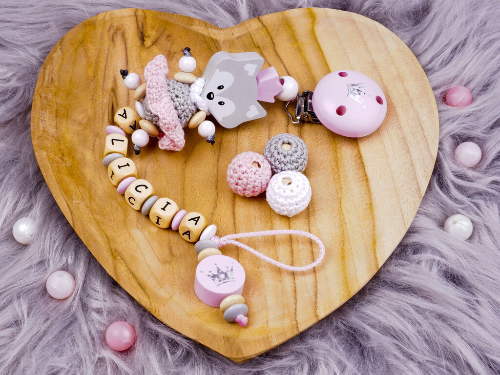 Die abgebildeten Schnullerketten sind Designbeispiele, die je nach Länge des Namens oder nach Euren Individualisierungswünschen verändert werden um die gesetzliche Norm der Schnullerketten von 22cm Länge (ab Clip) nicht zu überschreiten.