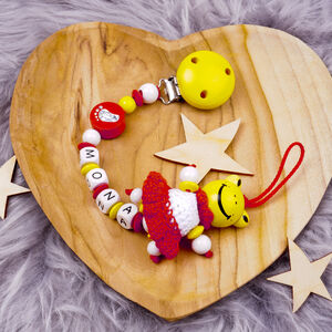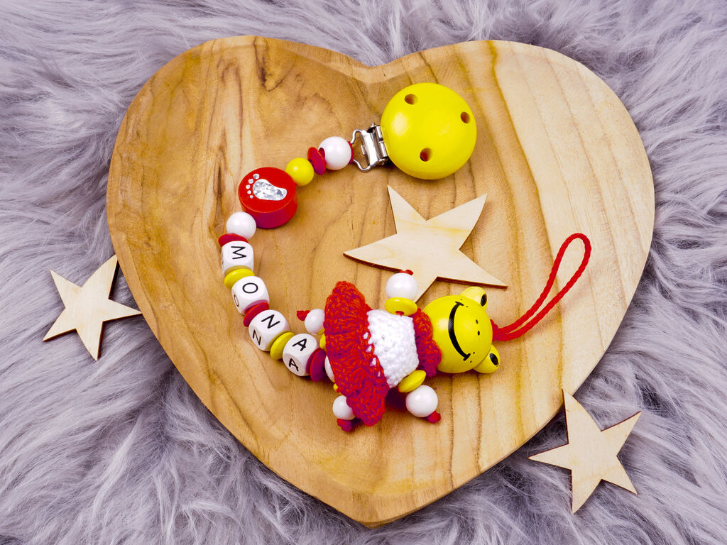 Die abgebildeten Schnullerketten sind Designbeispiele, die je nach Länge des Namens oder nach Euren Individualisierungswünschen verändert werden um die gesetzliche Norm der Schnullerketten von 22cm Länge (ab Clip) nicht zu überschreiten.