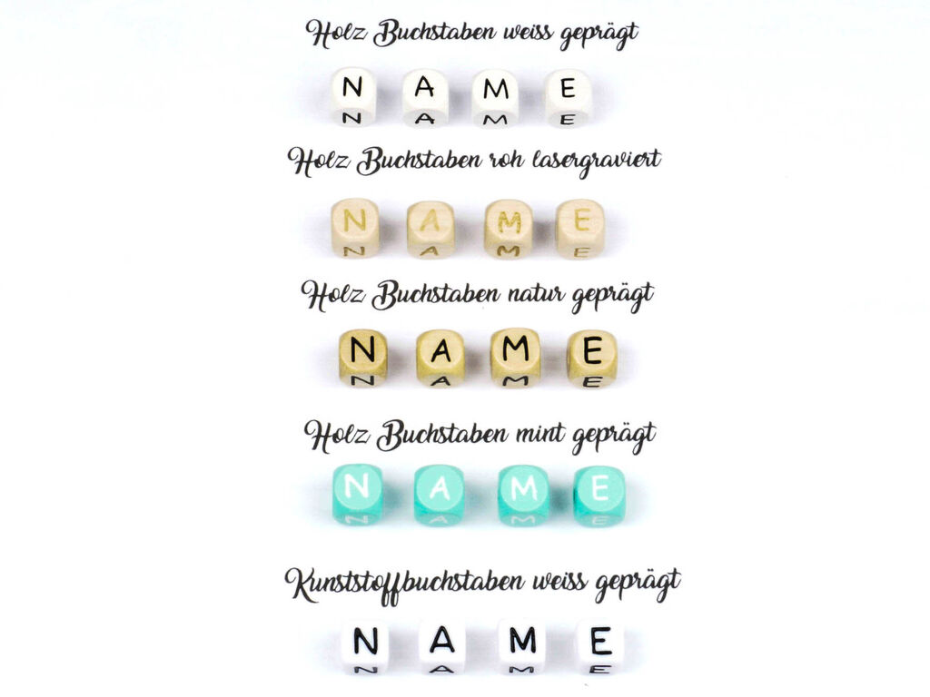 Die abgebildeten Schnullerketten sind Designbeispiele, die je nach Länge des Namens oder nach Euren Individualisierungswünschen verändert werden um die gesetzliche Norm der Schnullerketten von 22cm Länge (ab Clip) nicht zu überschreiten.